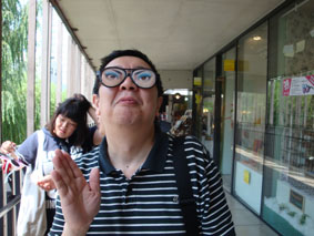 仁寺洞のサムジキル内の不思議なメガネを売っている店の前の試し掛けコーナーで/決して、マツコ・デラックスではない