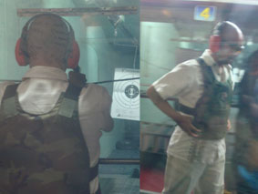 坊主頭の怪しいスナイパーとおぼしき石塚の勇姿/明洞実弾射撃場はいつも日本人が大勢いる