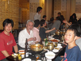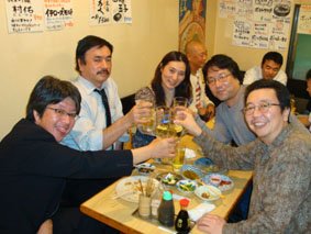 福岡演劇のひろばで知り合った、佐賀の通称・女王を迎えて、きくやの2階で乾杯する、左から、林さん、中村さん、女王、一郎さん、私/この席は、クマさんの生前最後の写真(※2009年5月第2週の3枚目の写真)となった場所。その後も、きくやに行くと、なぜかこの席に座ってしまう。
