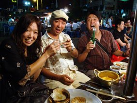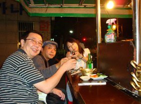 鍾路3街の屋台で、最後の夜の乾杯!/中央が青木さん、その右が『豚とオートバイ』でチェ・バンドンの妻を演じた新山陽子。