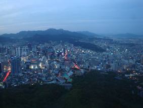 ソウルタワーの上から観た夕暮れのソウルの街/上はソウル駅方面で、下は明洞から鍾路方面。左の方の白く光っているのが明洞ミリオレ