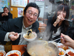 韓国で日本の漫画の翻訳出版などもしている李さん(右から3番目)や中村さん(その隣り)、青木さん(右端)らとおしゃれなチャドルベギの専門店で乾杯!