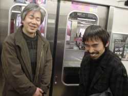 龍昇企画の龍昇氏(左)とク・ナウカの宮城聰氏のJR車内での珍しいツーショット