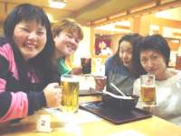 湯上りの一杯で御機嫌の月光舎女優陣/左から岡村、華宮、高木、とりい
