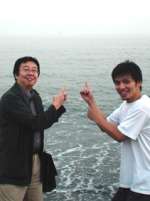 季節はずれの茅ヶ崎海岸で霞むえぼし岩を指差す私と元・月光舎の瀧川英次(12月に共演する)