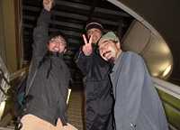初日乾杯の場に向かう、左から瀧川英次、P.E.C.T.主宰の中嶋比呂嗣、カメラマンの相川博昭。みんな腐れ縁