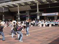 博多駅前広場でのふくこいアジア祭り2003の踊り/審査員が揃いの半被(?)を着て神妙に見ているのが笑える