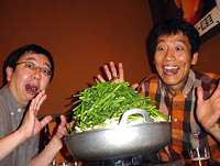 もつ鍋のチョー山盛りのニラにヒョエー!と驚く小須田氏と私/わざとらしくてすみません……でも、ホントに驚いたんだから! 洗面器のような鍋にも注目!