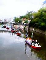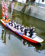 これが、船乗り込み! 歌舞伎役者たちを乗せ、のぼりを立てた8艘の船が、博多川をゆっくりと下ってゆく!/風情があるなぁ
