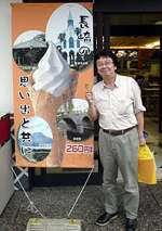 学院へのお土産を下げ、ソフトクリーム片手に『長崎の思い出と共に』の看板の前で/帰りの川登SAにて