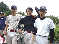 野球の練習を終えて疲れ気味(でも、笑顔)の次男の司苑(しおん・中央)と友人たち/相模川河川敷のグラウンドの横にて