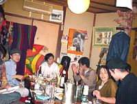 公演後、学生たちも一緒に飲みに行った(といっても、彼らは健全に、というか当然、アルコールは飲まなかった!)Moon Shan[ムーン・シャン]で、弥次さん役の寺っちゃんこと寺十吾(右端)と舞台監督の井村昂(その左)と、まだ弱冠17歳の学生の酒井香奈子(左端)と私/古い付き合いの井村氏は、知る人ぞ知る黒テント『キネマと怪人』のドラゴンその人!