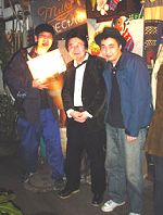 Moon Shan[ムーン・シャン]の外で、寺十、私と天野作品の映像を作っているハマジこと浜嶋将裕氏(左)/みんないささか酔いどれてて、妖しい……