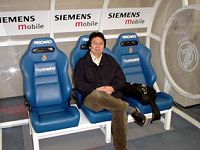 同じくレアルマドリード・ミュージアムで、ホームグラウンドのサンチャゴ・ベルナベウのベンチ席に座って御満悦の私!/でも、サッカーにあまり興味のない私としては、その価値がわかりませんでした(すごいらしいけど)……その2