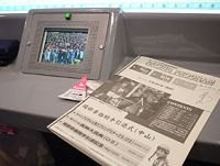 指定席の小さなモニターに映し出された、後輩の騎手たちの御輿に乗せられている岡部(「馬の上より怖かった」といっていた)と、指定席の席章と、岡部とシンボリルドルフが表紙の“岡部幸雄騎手引退式”と書かれたその日のレーシングプログラム/岡部のかわいいサインもあるし、これはずっと取っておきたい