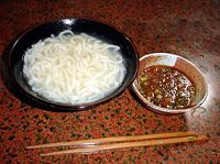 ちょっと白く濁った茹で汁に入った細めのうどんとコクのあるつけ汁/うどんを食べ終えた後、茹で汁につけ汁を入れたのも、うまい!