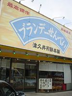 津久井湖名物のブランデーせんべいの店の看板/なぜか「目にとても良いものがあります」という張り紙もあって、薬のようなものも売っていた