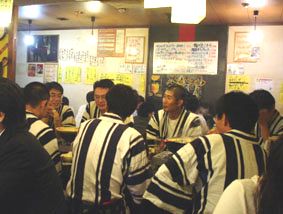 いつも行く中洲の『ふとっぱら』にも山笠の法被軍団が! これは東流の法被の男衆/祭り期間中の冠婚葬祭は、一流ホテルでも出入り自由な、この法被姿で行くそうな!