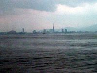 朝9時、博多港を出発、一路、コビーで釜山港へ!/博多湾を出て行くと、福岡ドームや福岡タワーが遠ざかっていく