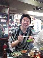 これよ、これ! ヤンゴプチャンを食べながら幸せそうな私! やっぱホルモンは炭火でしょ!/チャガルチ・ヤンゴプチャン通りの某店にて