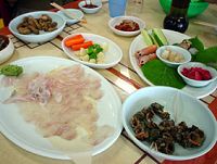 これがヒラメの刺身の盛り合わせ! これにメバルの焼き魚やいろんなものがついてくる!/朝からヒラメの刺身でメクチュ(ビール)を一杯だなんて、釜山ならではの贅沢!