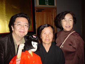 文楽の人形を操らせてもらっている私と人形遣いの農家のおばちゃん(真ん中)/おばちゃんはいかにも農家の人って感じでしょ……右の人は写真を撮っていたら、突然「あたしも撮って!」と入ってきた見知らぬ人