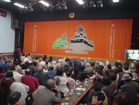 片岡演劇道場の客席の前の方と舞台/右の方のおじちゃんたちは団体客、舞台の前には贔屓の役者がいる女性客がいる