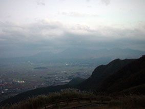 阿蘇外輪山の展望台から阿蘇山[高岳]を望む!/ふもとの町は阿蘇山と外輪山に囲まれた盆地になっている……しかし、寒かったぁ!