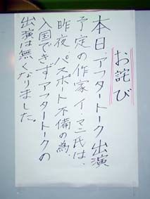 ![]() 中部国際空港と名鉄名古屋駅を結ぶ特急の車内には、先頭車両から見える風景が映し出されている/電車でGO!みたいだけど、これを見ているところに誰かが飛び込んできたり、事故の瞬間を見たりしたら怖い! ![]() かつての東海月光舎の若手女優たちも、すっかり貫禄がついた! 左から、美月ノン、小熊ヒデジ氏、まどか園太夫、長江ヒロミ/しかし、みんな演劇に関わってくれていて、うれしい! ![]() 小松家恒例、まとめて誕生パーティーの、左から、義母、私、次男/狭い我が家に総勢10人が入った! ![]() 『豚とオートバイ』初日後の懇親会での楽天地のモツ鍋!/この山盛りが、いつの間にか鍋に収まってしまう! イ・マニ氏に食べてもらいたかった…… ![]() 『豚とオートバイ』のロビーに張り出された、イ・マニ氏入国出来ずのお詫び/結果としては、入国拒否、強制送還! まさかまさかのハプニングだった! |