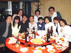 PmP初日の懇親会に駆けつけた私(一番左)と、久しぶりに再会した藍色りすとの太田さん(私の右隣)と、大西一郎氏(太田さんの右隣)と、全国各地の制作者の方々/西巣鴨駅近くの中華料理店にて