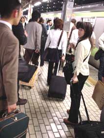 PmPの初日は、みんな東京に出て来たままだったので、20人ぐらいがキャリーバッグを引きながら移動していた!/地方からの人ばかりだし大変だ……ラッシュ時は避けられたのかな?