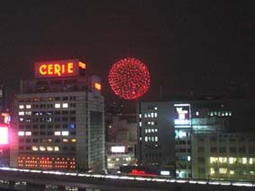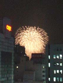 学院の屋上から観た花火の様子/ビル街の間に広がる花火は、まるで特撮映画の合成画面のよう! 下にあるのはJRの関内駅のホーム