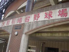 大和市営引地台球場は、平成8年の改修の時、『ドカベン』の漫画家・水島新司のアドバイスを受けたり、山田太郎と里中智のブロンズ像が設置されたところから、ドカベンスタジアムとも呼ばれている/大きな看板の下に、DOKABEN STADIUMと書かれたプレートがある!