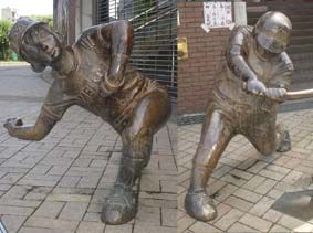 球場の入り口に設置されている里中(左)と山田(右)のブロンズ像/漫画よりもリアルな感じがするが、やはりバランスがちょっと……しかし、『ドカベン』ファンにはうれしい! どうせなら、岩鬼や殿馬も作ってほしい!