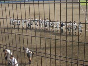 勝利後、応援してくれた父母や関係者席に向かって挨拶をする藤沢総合ナイン21名と、監督と部長とマネージャー/なんたって、県大会初勝利どころか、2回戦も勝ってしまって大拍手!