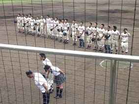 勝っても負けても、父兄やOBたち等関係者のいる応援席に挨拶!/さすがに負けた後は、ちょっと放心状態の21人……負けて強くなれ! 次は3回戦突破だ!