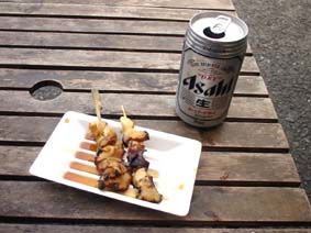 つぶ貝(左)とさざえ(右)の串焼きと缶ビールで一杯!/これでも満足だけど、今度はついでじゃなく来て、さざえのつぼ焼き食べたいな!