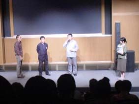 第5回横濱学生映画祭の会場にて/映画の上映の前に、韓国フィルムアカデミー院長のパク・キヨン氏(中央の白い服)と監督科の講師の先生(その左・すいません、名前、聞き逃しました)によるトークが行われた! あと20年若かったら、入りたい!