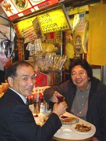 餃子の三陽の屋台で、薙野さんと再会を祝して乾杯!/さすがに薙野さんも、そのメニューの名前(チンチン麺やらチョメチョメ麺やら)に驚いていた!