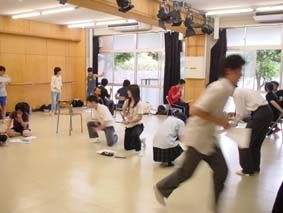 高校演劇部員のためのワークショップ2/立ち稽古に入ると、自分たちで椅子を用意したり、いろいろ動き回ったりと、みんなさらに生き生きし始める! 私も各チームをアドバイスして回ったが、一番多くアドバイスしたのは「もっと表情を意識してごらん」だった