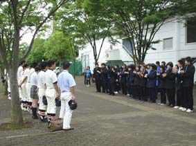 負けた後、整列して応援団や応援してくれた同級生たちに報告する藤総ナイン/右の方には父母たちもいて、みんなで泣きながらも「よく頑張った!」と笑顔で拍手をした!