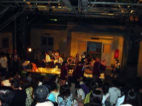 椿組恒例の毎日打ち上げとカンパ隊/昔は帽子を持って回っていたが、最近は大きなざるになった! 万札や五千円札の御祝儀が飛び交う! 21日にはカンパ隊でモロ師岡さんも回っていた!