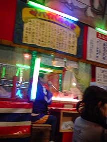 見世物小屋の入口で呼び込みのお姉さんがマイクで口上をいっているところ/この原色の妖しい照明がいかにも見世物という雰囲気を醸し出していていい! もちろん、御代は見てのお帰り! 入口で払わず、出口でしっかり取られる