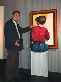 トリックアート美術館の絵@絵の前の台に腰掛けている少年の肩に私が手を置いているように見えるが、実際は平面の壁に描かれた絵の前で、ただ手を上げているだけなのだ/よく見ると、床と絵の黒いところの違いがわかる