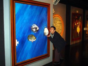 トリックアート美術館の絵B絵から魚が飛び出しているように見えるが、これも壁の平面に描かれた絵/他にもいろいろ不思議な絵がいっぱいある