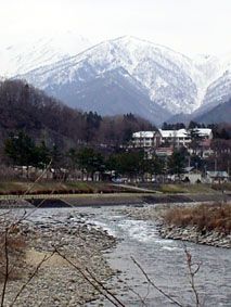 利根川の上流と、向こうにまだ雪化粧が残る谷川連峰の山が見える水上温泉・諏訪峡の入口付近/近くに全国の温泉を巡って歌を詠んだ与謝野晶子の「岩の群 おごれど阻むちからなし 矢を射つつ行く 若き利根川」という歌碑があった