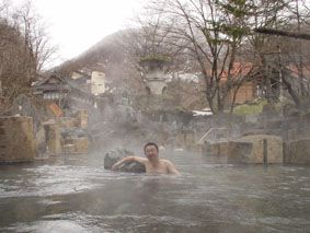 宿から、前を流れている川にかかった吊り橋を渡って露天風呂へ行く/右に見えるのが、まるで『千と千尋の神隠し』に出てくる油屋のような汪泉閣の建物の一部