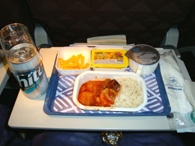 海外旅行写真の定番・大韓航空エコノミークラスの機内食/行きはチューブのコチュジャンを頼まなかったのでない