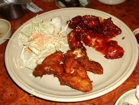 これが今回食べたおいしいチキンの第一弾・塩味と甘辛いタレのどちらもグー!/しかし、韓国は牛肉や豚肉だけでなく、チキンもおいしい! ポパイ・チキンも好きだったし、バンボ・チキンという有名な店もある