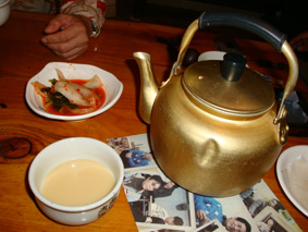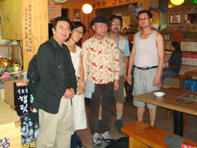 韓国での初日の夜を祝って、おいしいマッコルリでコンベ(乾杯)!/左から、私、妻、ハンキンさん、熊谷さん